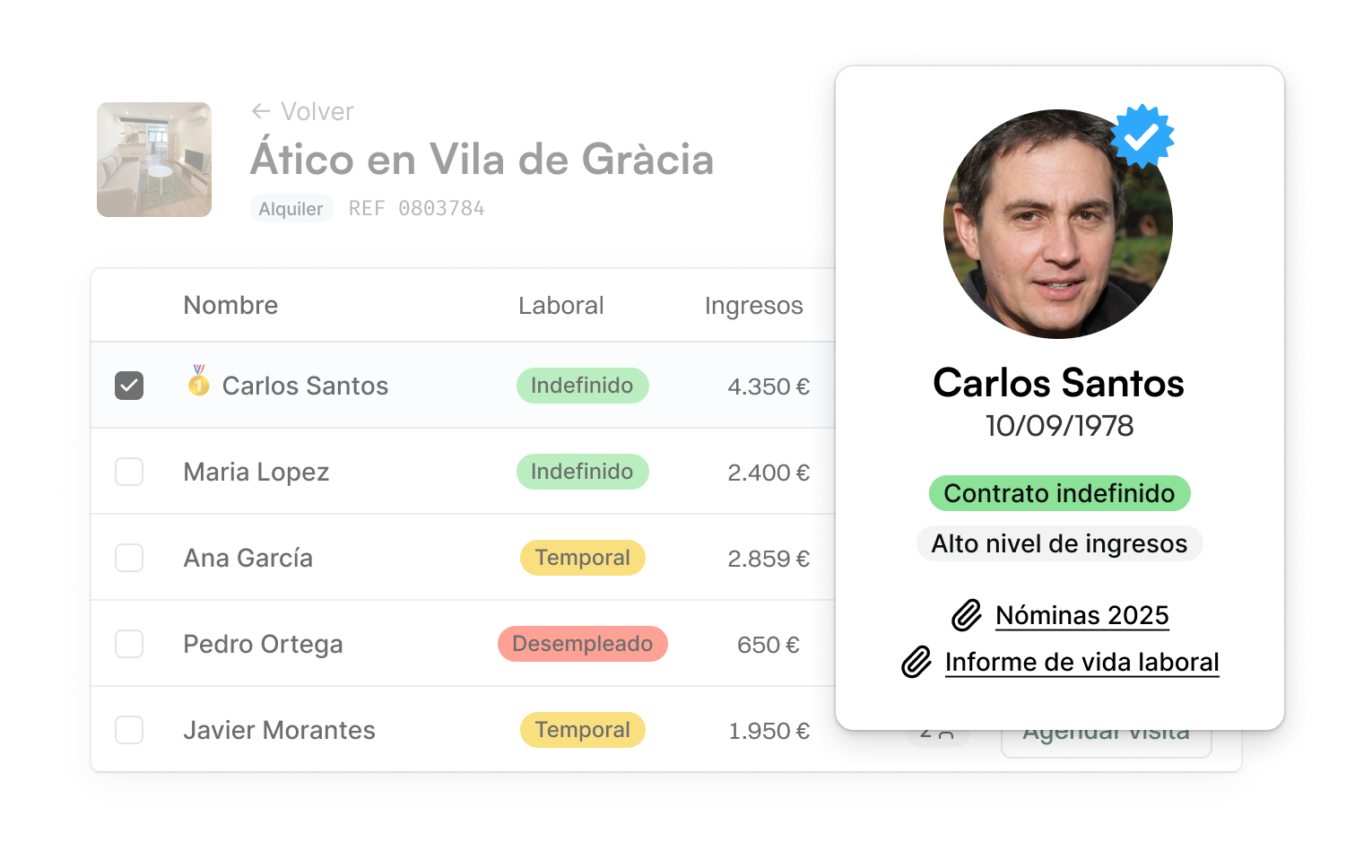 Recopilamos información básica como ingresos, contrato laboral, duración de la estancia y número de convivientes. A partir de eso, priorizamos los perfiles más solventes y compatibles con tu propiedad. Puedes ajustar los criterios tú mismo.