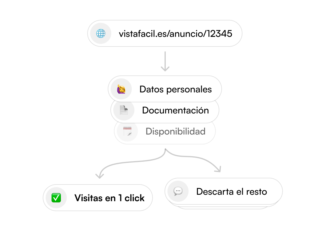 Vistafácil es una herramienta de filtrado de inquilinos y gestión de visitas para agentes inmobiliarios. Recoge datos clave de los interesados (edad, ingresos, tipo de contrato...) y te permite organizar visitas sin perder tiempo en llamadas o mensajes.